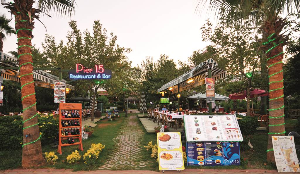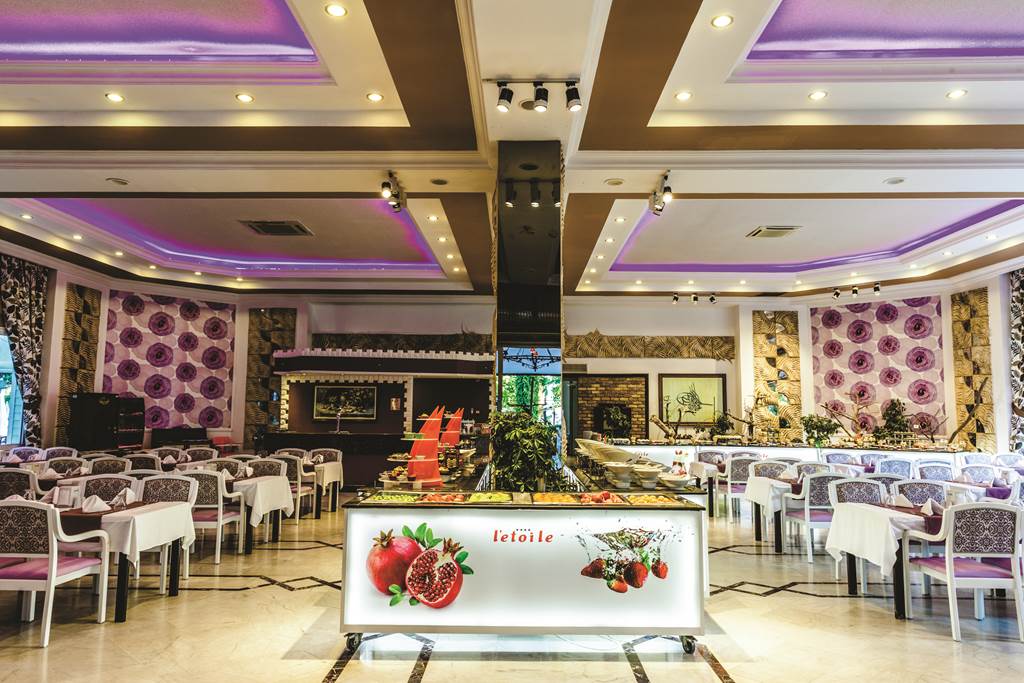 The main buffet restaurant serves breakfast, lunch and dinner with international dishes, Turkish favourites and live show-cooking at peak times. Expect salads, grills, hot mains, desserts and fresh fruit. The hotel usually asks that beachwear isn’t worn at dinner.