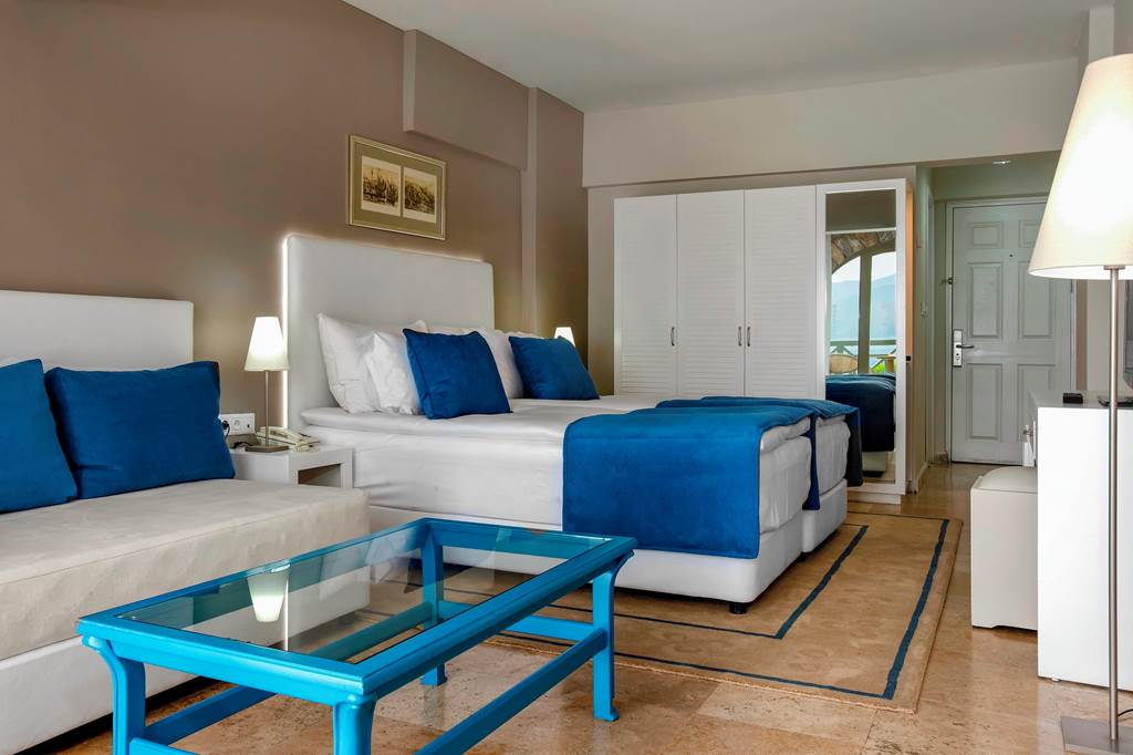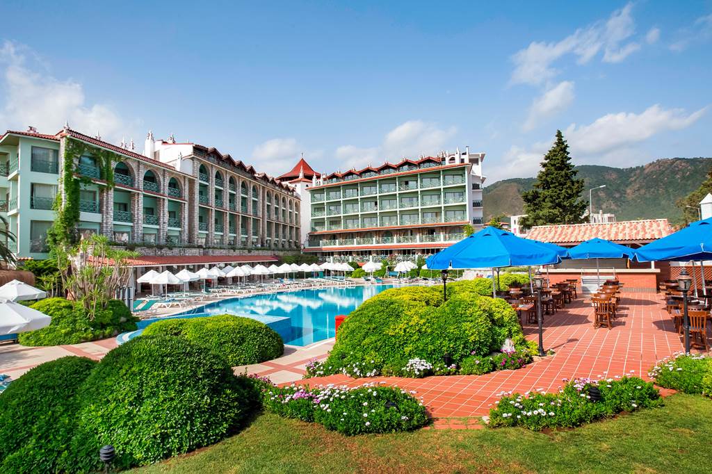 The hotel is set directly on the beachfront in Icmeler Bay, with its own private area on the sand-and-shingle beach. Icmeler resort centre, with its canal-side promenade, shops, bars and restaurants, is about 300 metres away and easily reached on foot.