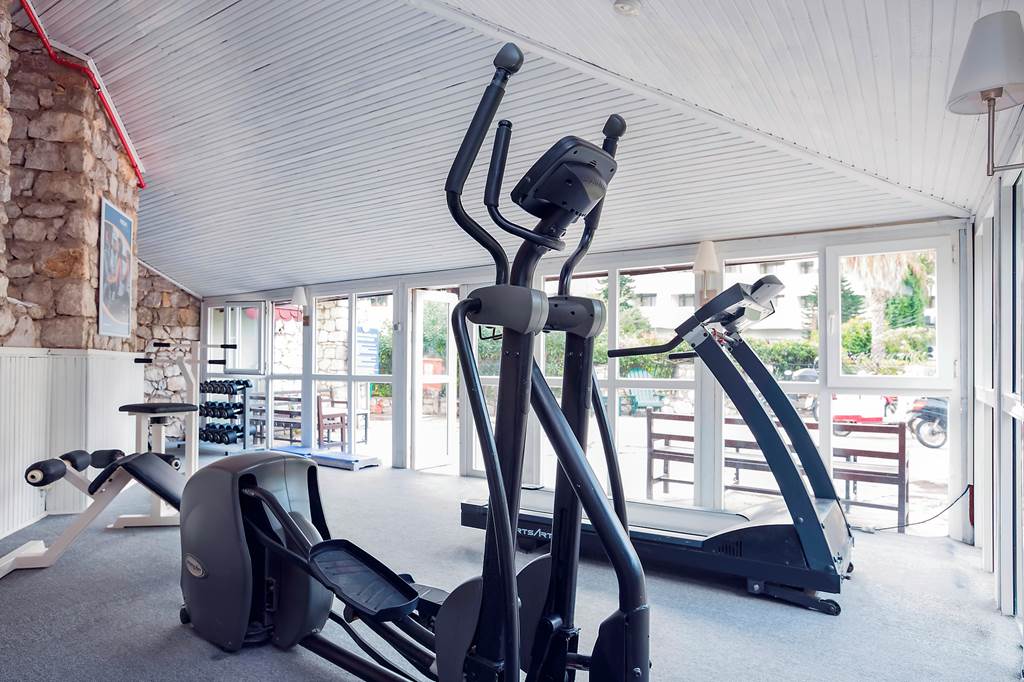 Fitness fans can keep up routines in the air-conditioned gym, which features cardio machines, a free weights area and a stretching zone, open daily in the main summer season.