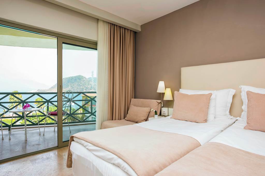 Wake to open sea views over Icmeler Bay from your balcony. Includes flat-screen TV, Wi‑Fi, safety deposit box, hairdryer, shower bathroom, air conditioning, coffee-making facilities and minibar (chargeable). Daily cleaning with towel change on request.
