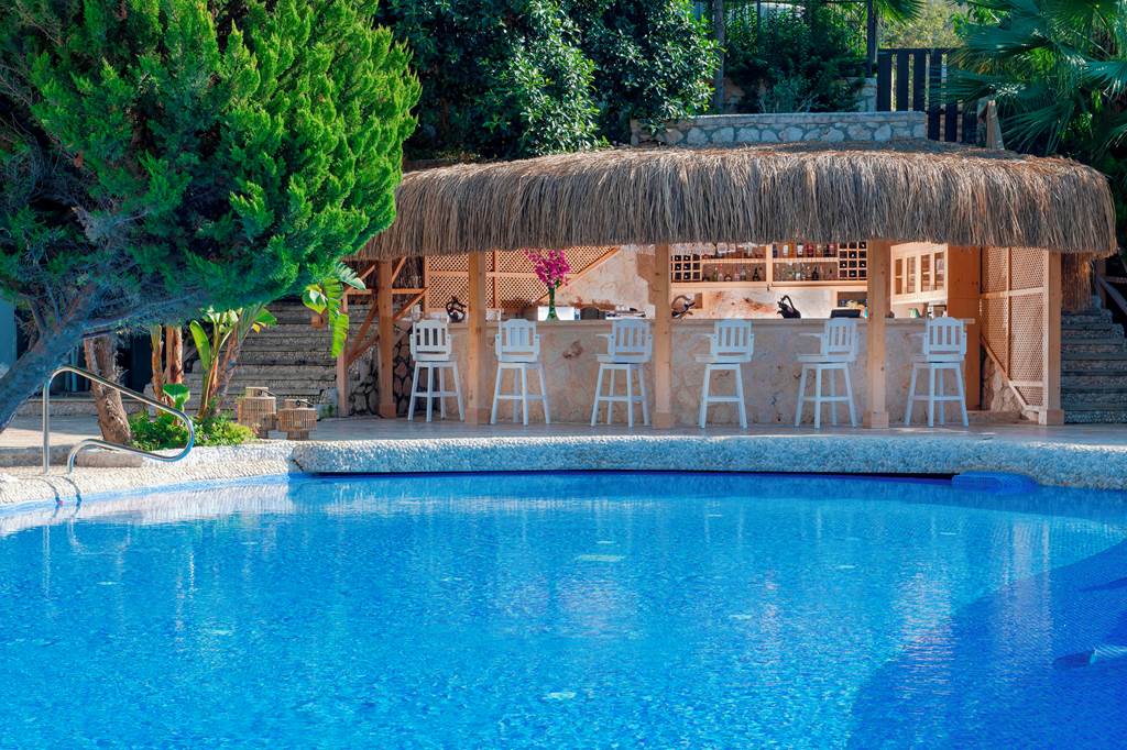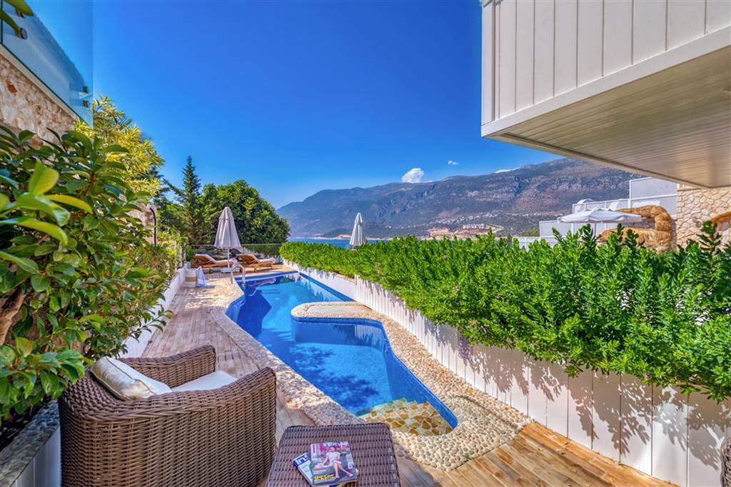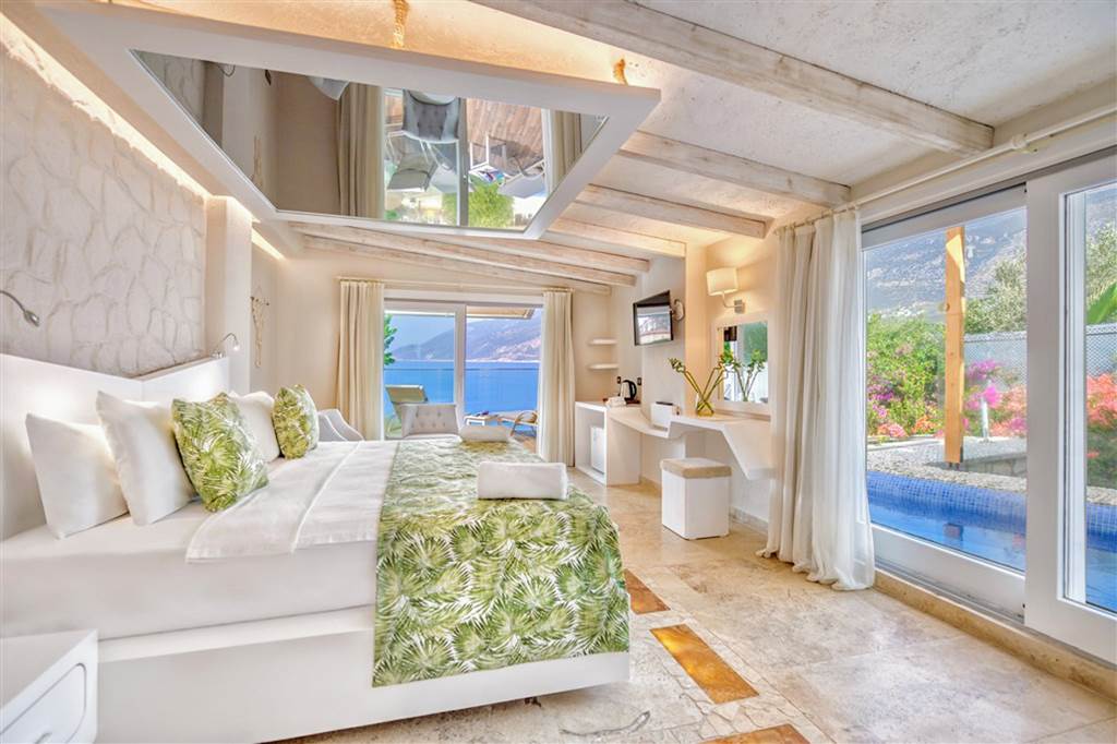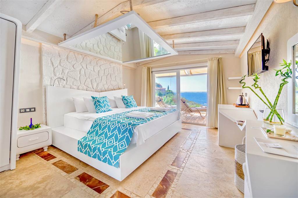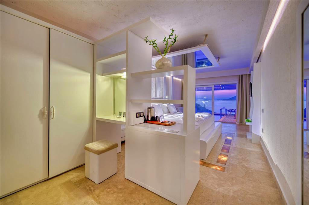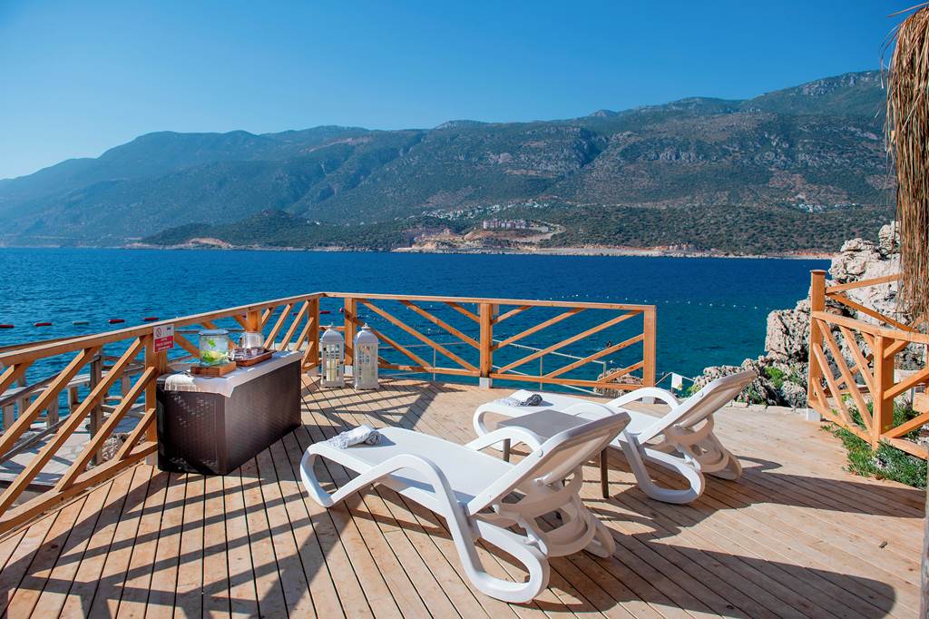 Terraced platforms and sunbathing areas step down towards the sea, so you’re never far from the water. The nearest larger beach is around 1.9km away on the peninsula and in Kas itself – easy to reach by taxi if you fancy a change of scene.