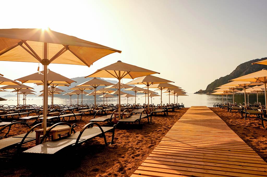 The real star, though, is the hotel’s beachfront setting. Step straight from the pool terrace onto the sand and the hotel’s private beach area, where you can soak up panoramic views of Icmeler’s bay and the surrounding pine-cloaked hills.