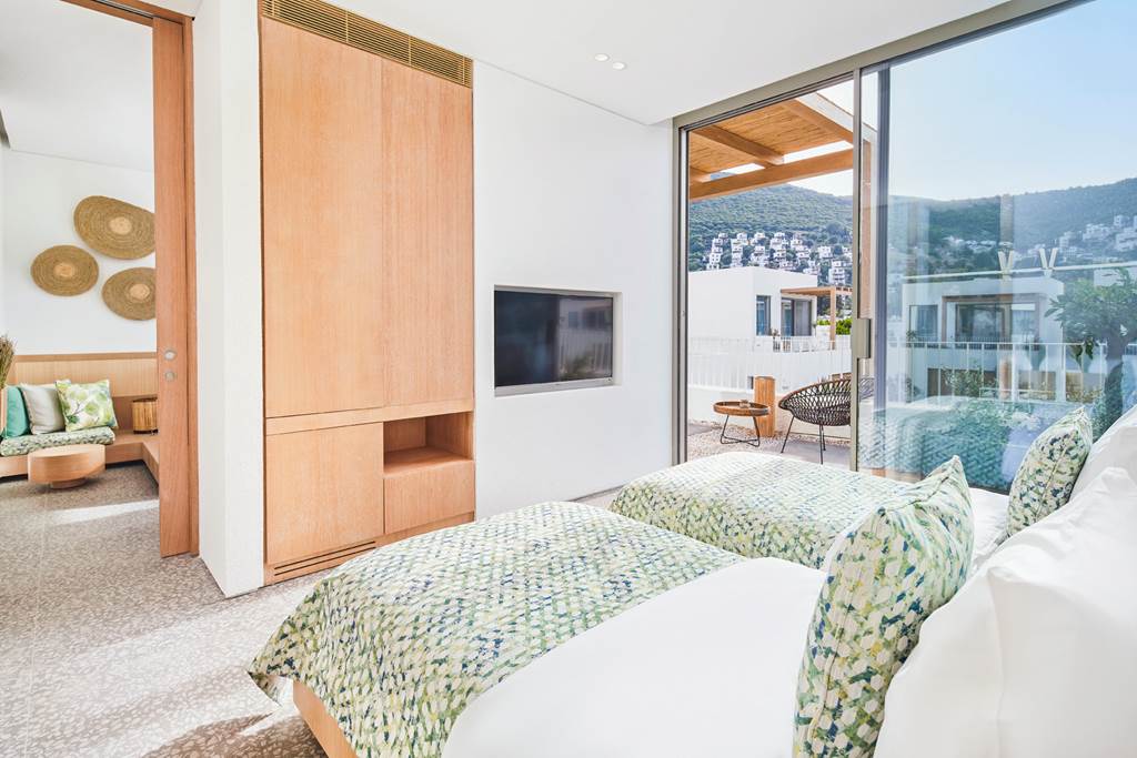Set among greenery, these rooms embrace the resort’s garden feel while keeping interiors bright and contemporary.